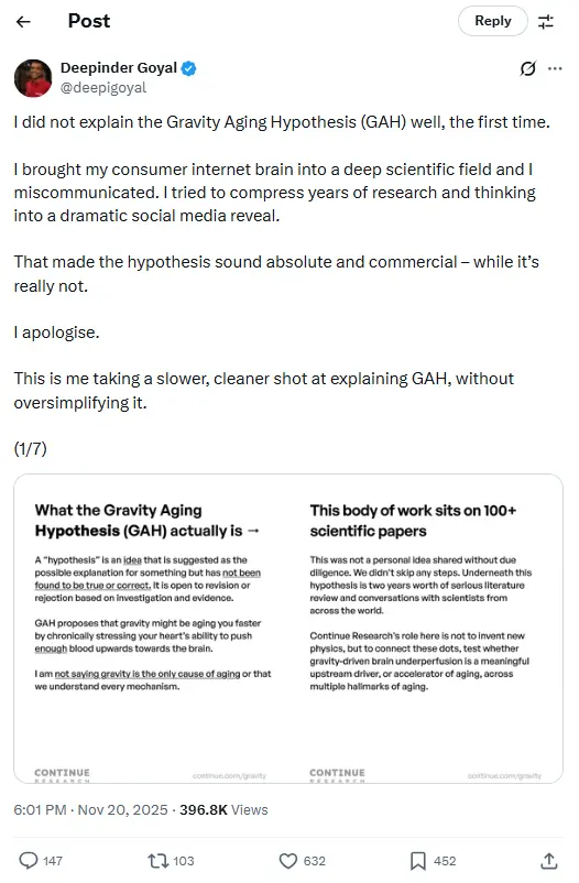Goyal’s personal research focus — something he calls the “Gravity Ageing Hypothesis” also adds fuel to the conversation. The hypothesis suggests that gravity over time may reduce blood flow to the brain and contribute to ageing, though this is not widely accepted in mainstream science yet.