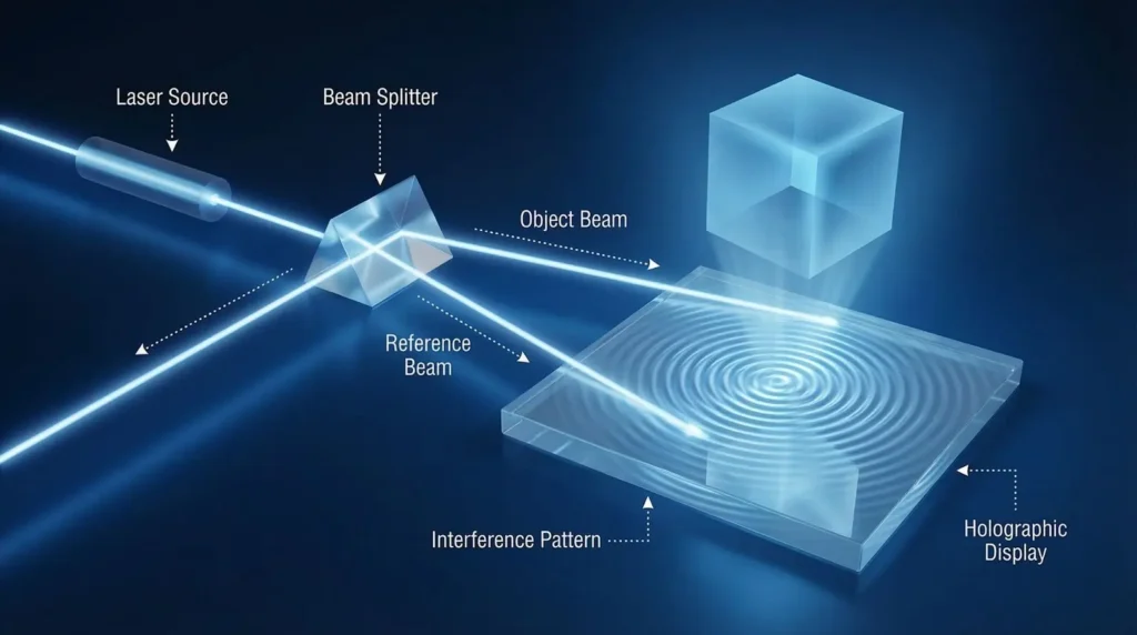 At the core, holography works by recording and recreating how light waves interact with an object. Traditional holography uses lasers to split light into two beams — one reflecting off the object and another acting as a reference. When these beams combine, they form an interference pattern that holds 3D information.